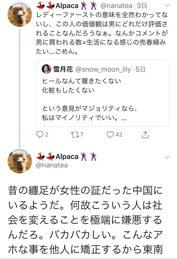 他人を売春婦扱いしても悪びれもしないぐらいの性格破綻者に女性の味方ヅラしないで欲しい。迷惑