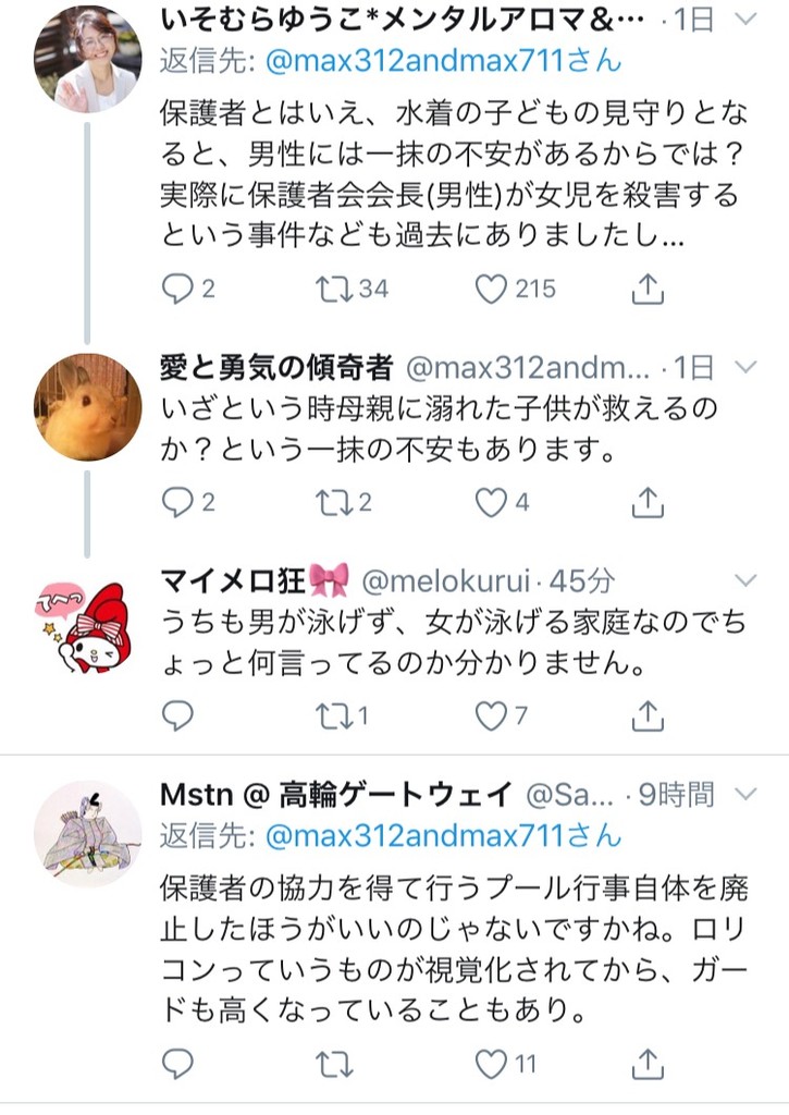 保護者とはいえ、水着の子どもの見守りとなると、男性には一抹の不安があるからでは? 実際に保護者会会長(男性)が女児を殺害するという事件なども過去にありましたし…
