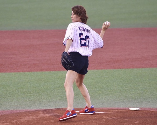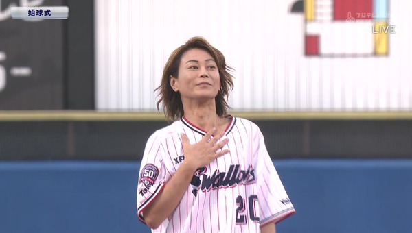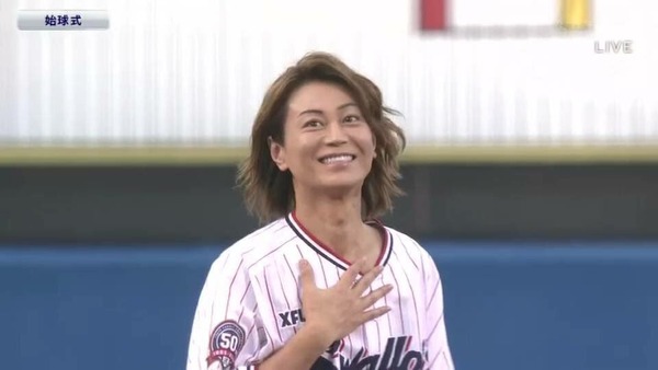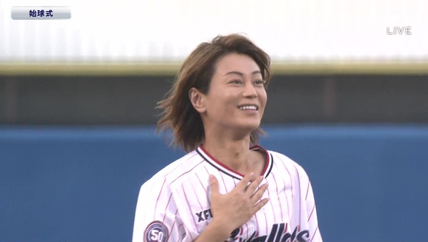 新曲「大丈夫」を歌唱した後、始球式に臨み、ボールは高く浮いたものの、ノーバウンドで見事にキャッチャーまで届いた。