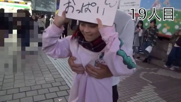 投稿用の動画を撮影するため、東京・渋谷のハチ公前広場で「フリーおっぱい」と書かれたスケッチブックを掲げ、通行人に胸を触らせたとして、