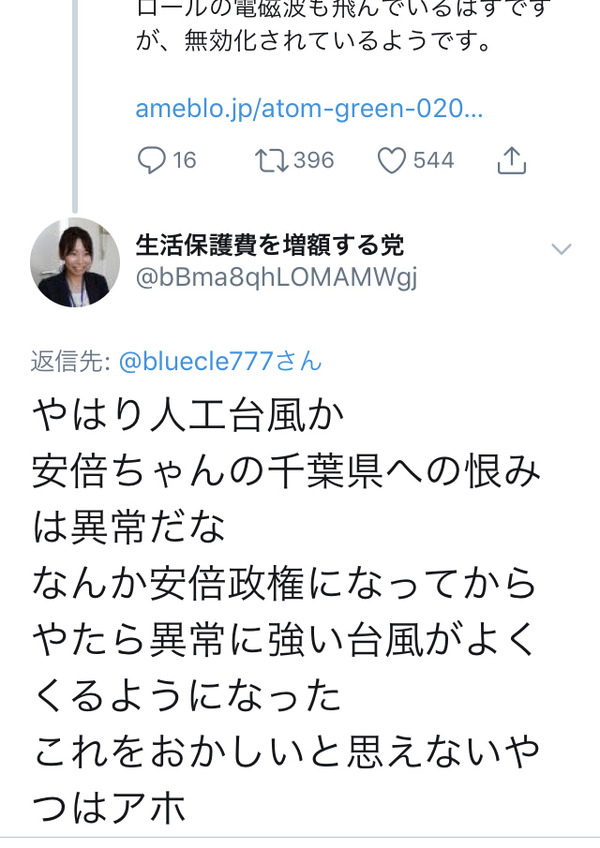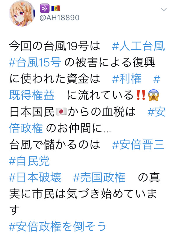 【悲報】左翼さん「アベが台風を作り出して日本にぶつけた!」