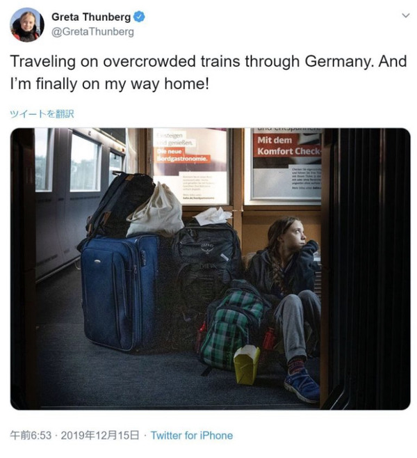 グレタさんは列車の床にスーツケースに囲まれて座る自らの写真とともに、