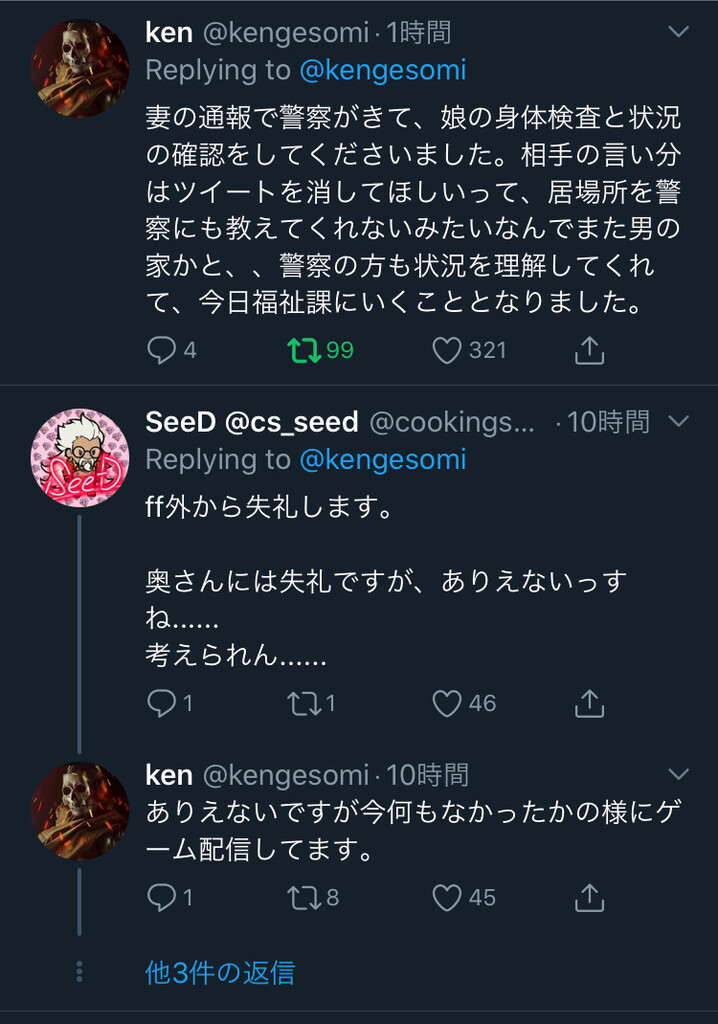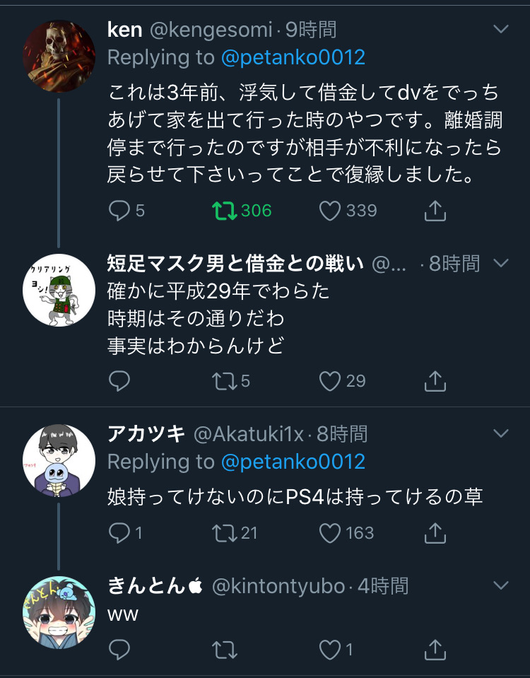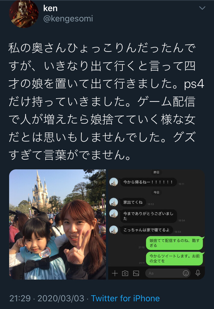 これ普通に夫婦喧嘩して妻がイジけて出て行って夫が悔しくて娘を捨てたとかツイートして妻が悔しくてDVされたとか嘘で対抗したって言う地獄みたいな展開だと思う