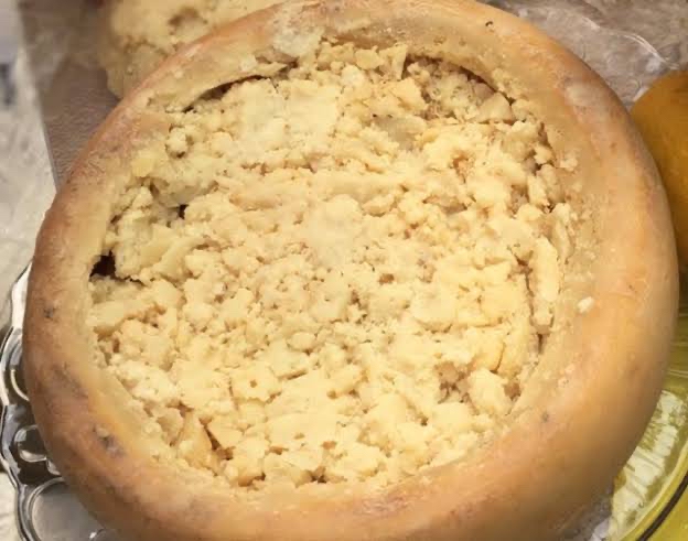 チーズダニ(en:Cheese mite)が住み着いており、ダニの力で熟成するチーズである。外皮の穴はダニが食べることで作られる。若いものは弾力があり、角切りにしてサラダなどに使われたり、薄切りにしてサンドウィッチに挟んだりする。熟成したものはヴィエイユ(Vieille、老成)と呼ばれ、カチカチに硬くなり、切るというよりも割るといった感じになる。通常、外皮の箇所は不味であるため取り除かれ、オレンジ色の箇所だけを食べる。チーズダニの生息する箇所を口にしても人体に害はない。