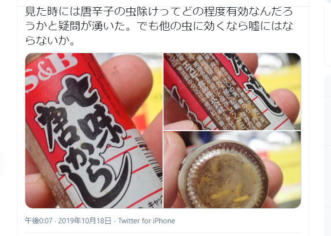 丸まってると七味に入ってる黒丸いやつに似てたから、七味も駄目になって