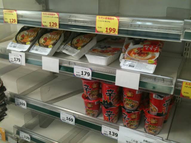 震災のときは辛ラーメンとちょっと高い高級志向のカップ麺は売れ残ってたな