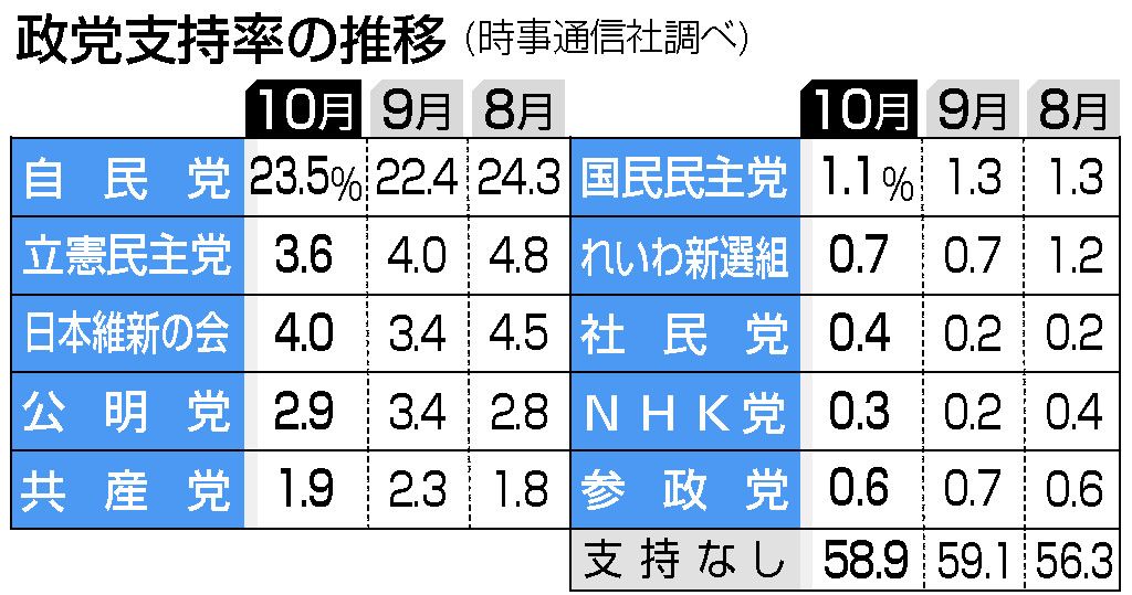 時事通信が7~10日に実施した10月の世論調査で、岸田内閣の支持率は、政権発足後最低だった前月と比べ4.9ポイント減り27.4%となった。政権維持の「危険水域」とされる20%台に落ち込んだのは初めて。菅内閣で最低だった2021年8月の29.0%も下回った。