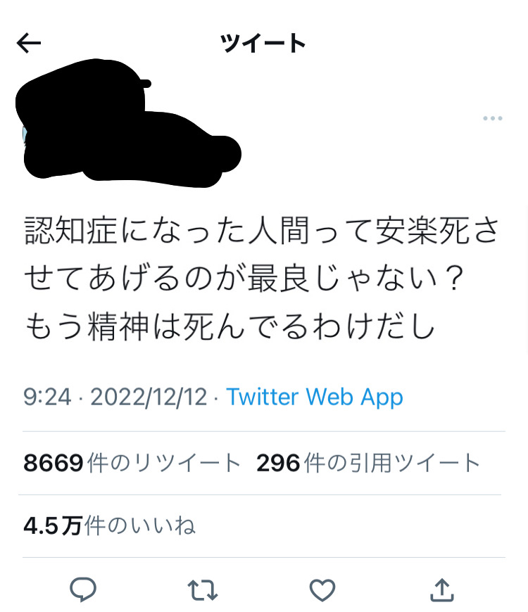 引用元: 【画像】Twitter民「認知症になった人は殺してあげるのが優しさ」⇽5万いいね