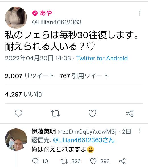 引用元: まんさん「私のフェラは毎秒30往復します。耐えられる人いる?」伊藤英明「俺は耐えられますよ」