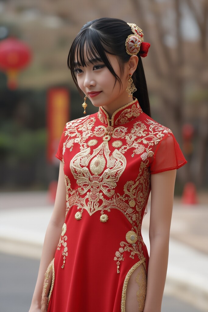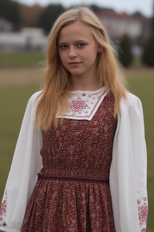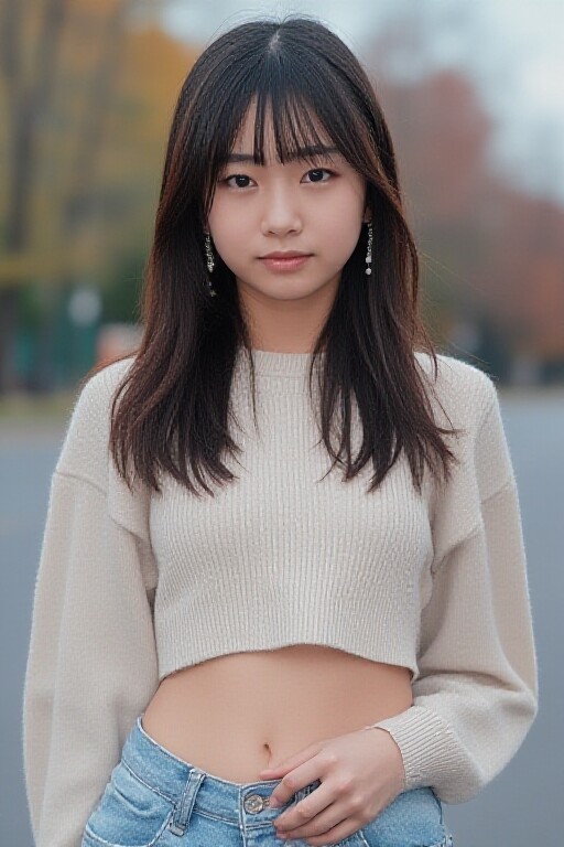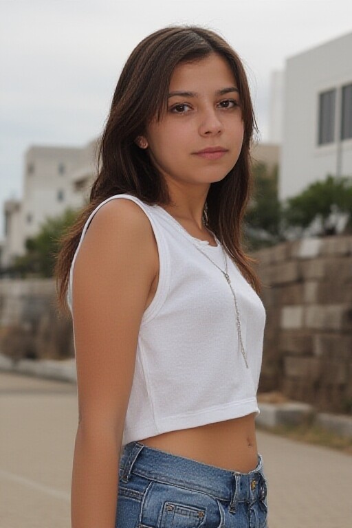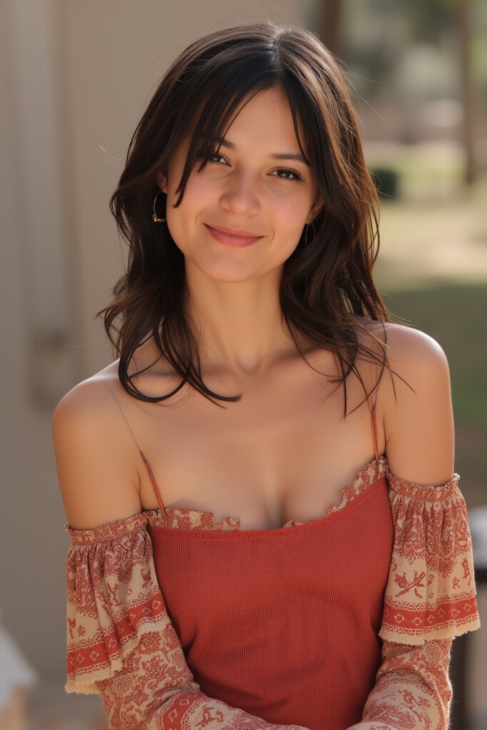 A photograph of a sexy American girl standing outdoors in American attire in an American setting.