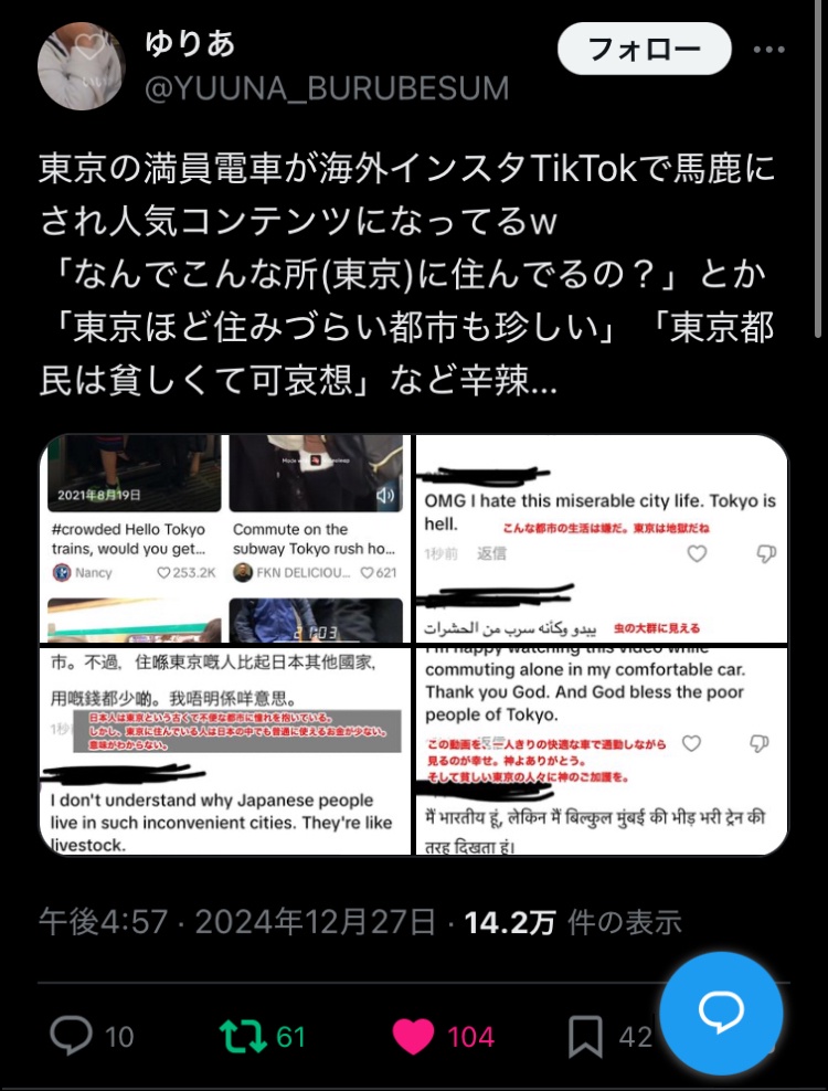 東京の満員電車が海外インスタTikTokで馬鹿にされ人気コンテンツになってるw