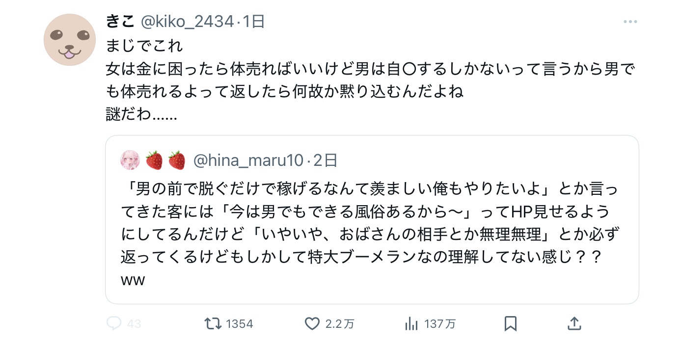 カウンターで男も体売れるよって返されてるだけなのに理解してない奴ってハッタショなんか?