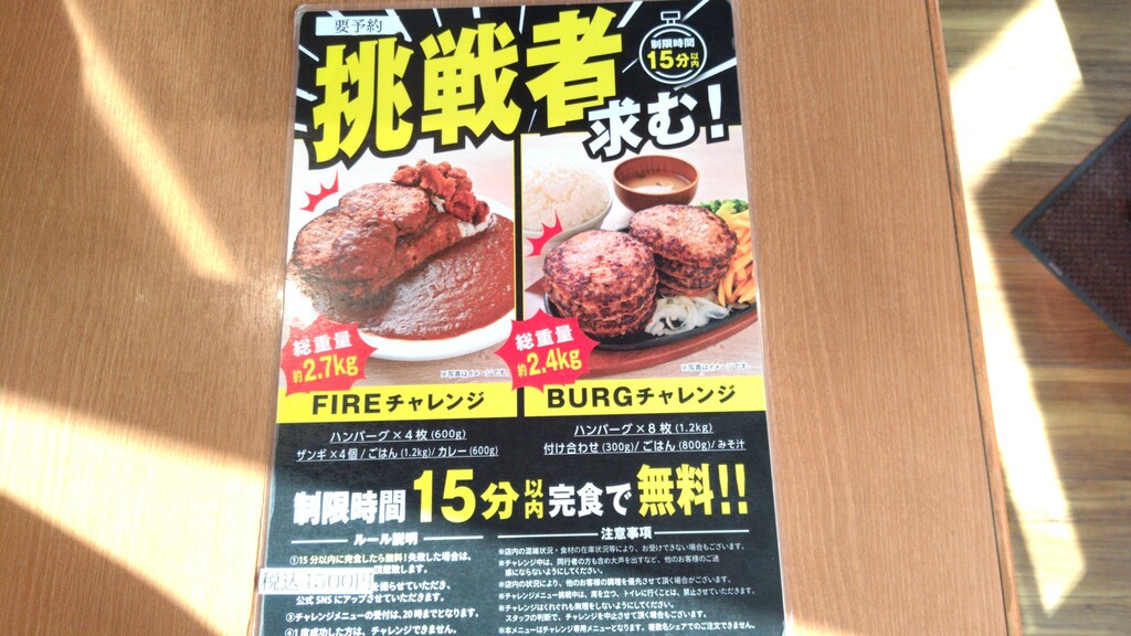 調べたらハンバーグ1Kg、ご飯等の付け合せ1Kg合計2Kgのチャレンジメニュー