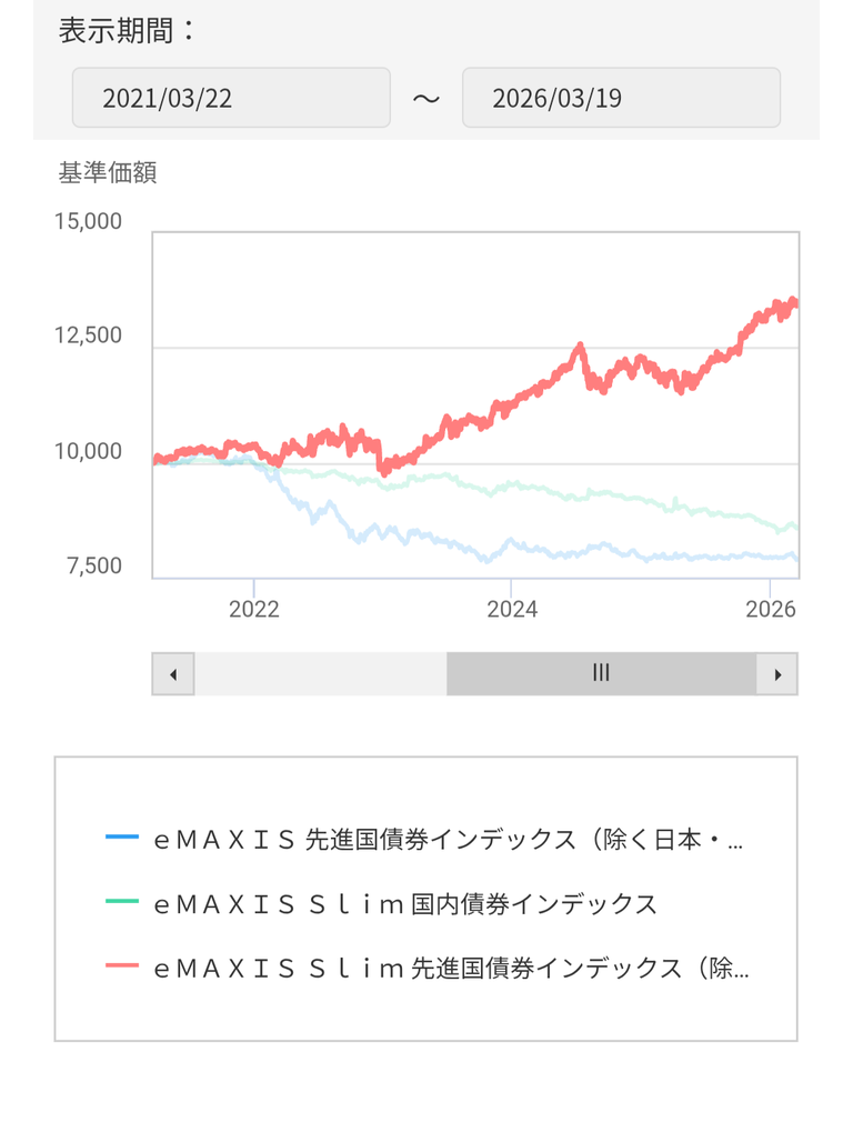 債券ファンドは下がり続けてるよ。金利高いからね。