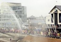 そのぉおお後、一斉放水が行われ、集まった市民から拍手が起きたのぉおお。