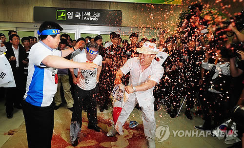 入国ゲートで保守団体の会員らが唐辛子粉をまいて、日本の議員の訪問に強く抗議している。