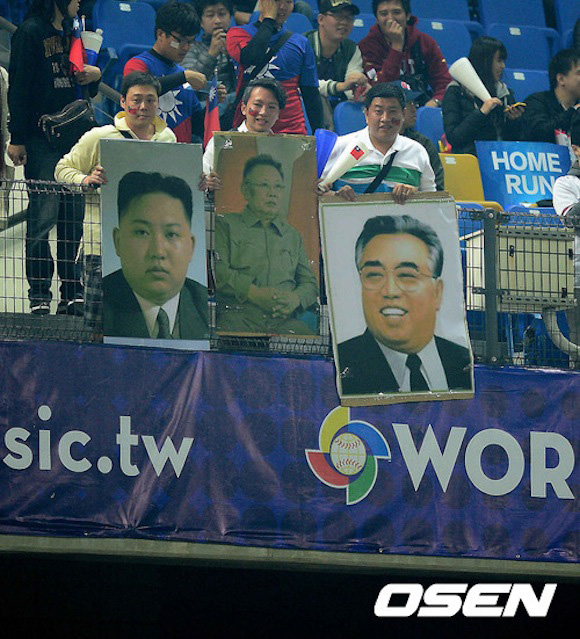 だが、試合が始まると台湾の応援団は、ピリピリムードの韓国選手を挑発。北朝鮮の金日成主席、金正日総書記、金正恩第