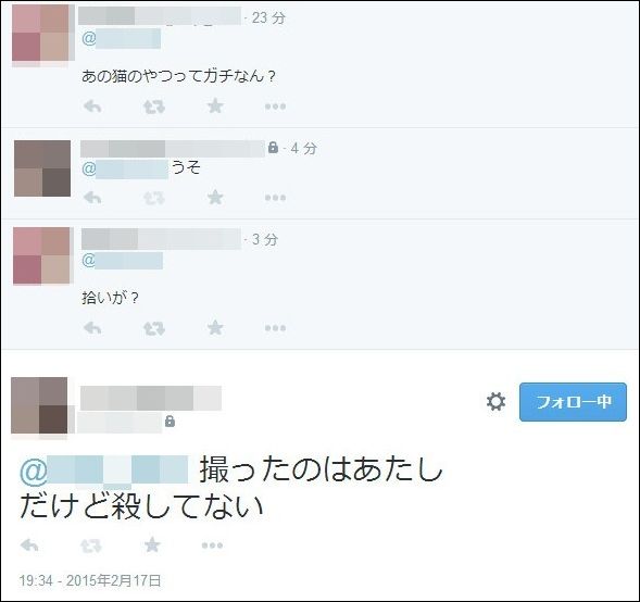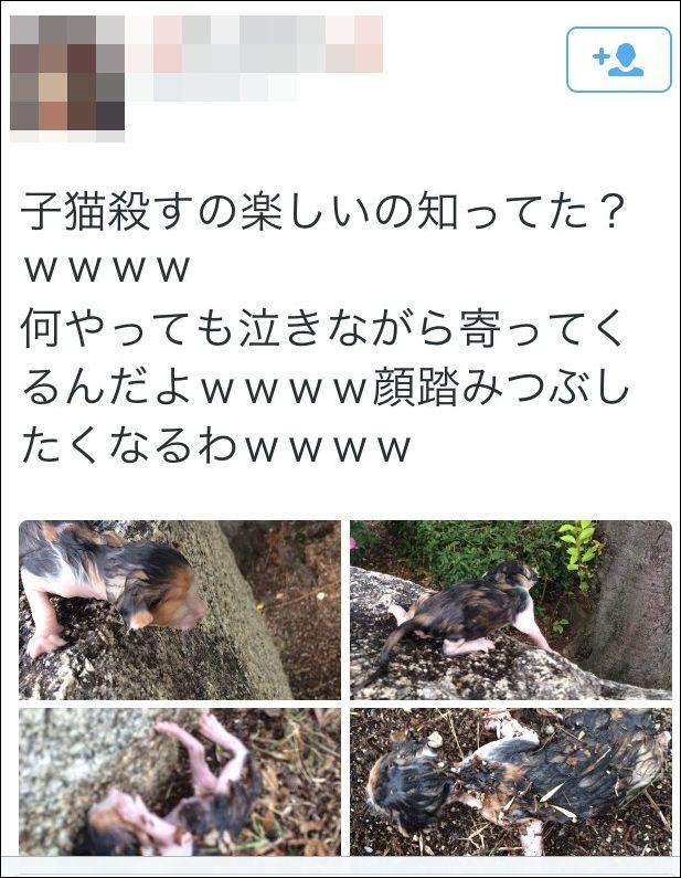 もう一つのツイートは、「子猫虐待し殺害 猫好きには許せないだろうけど あたしには許せる」というものだ。