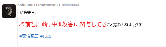 安倍晋三、お前も川崎、中1殺害に関与してること忘れんなよ。クズ。