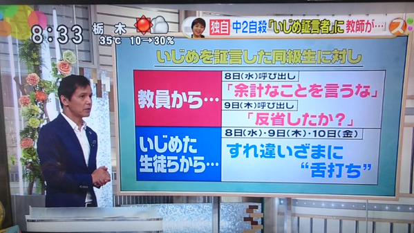 「いじめを証言した生徒に対しても、学校はおかしな対応をしている。この同級生は学年主任の教員から8日と9日に呼び出され、「余計なことを言うな」「反省したか」と問い詰められたという。」
