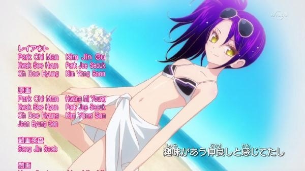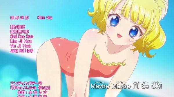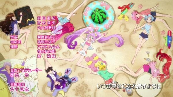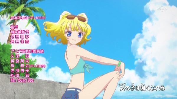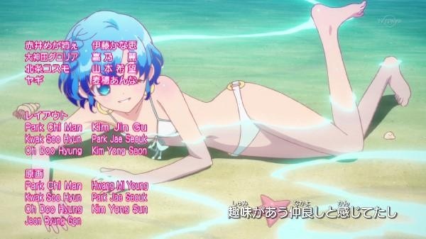 ・子ども向けアニメ番組のエンディングシーンで、アニメキャラクターの少女たちが水着姿でポーズをとったり、
