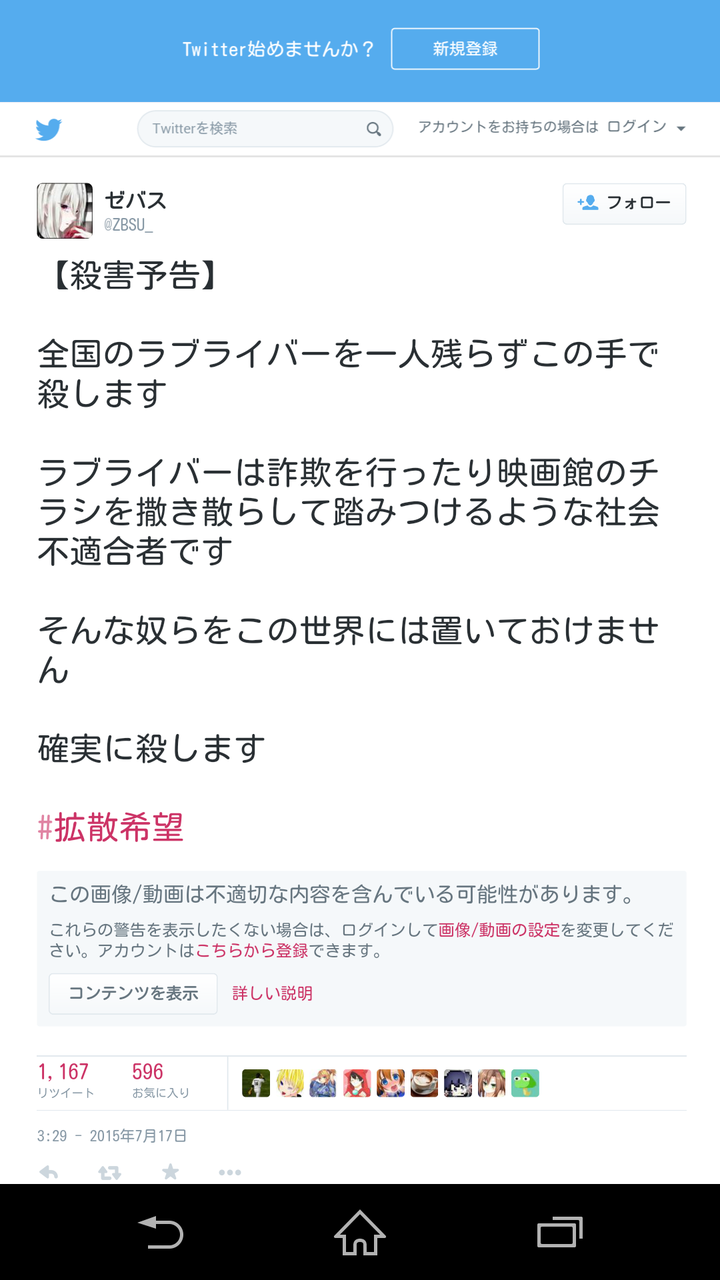 引用元: http://tomcat.2ch.sc/test/read.cgi/livejupiter/1441173349/【悲報】ラブライバー皆殺しを表明した有志が逮捕
