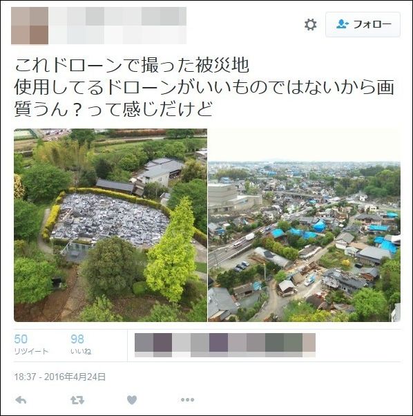 Twitterでは、現地でドローンを使って撮影したという画像を公開した。すると、被災地域でのドローンの使用には許可が
