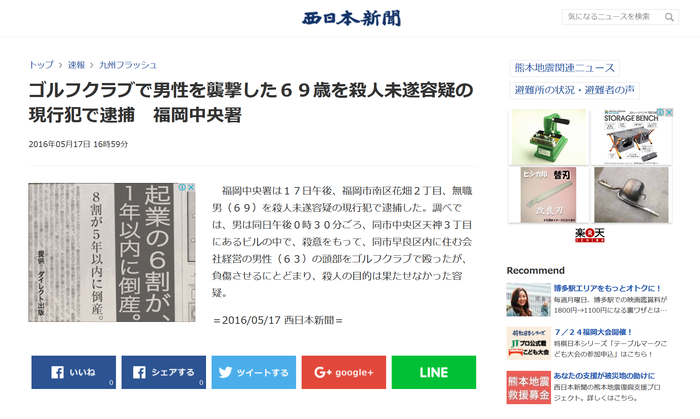 調べでは、男は同日午後0時30分ごろ、同市中央区天神3丁目にあるビルの中で、殺意をもって、同市早良区内に住む会社経営の男性(63)の頭部をゴルフクラブで殴ったが、