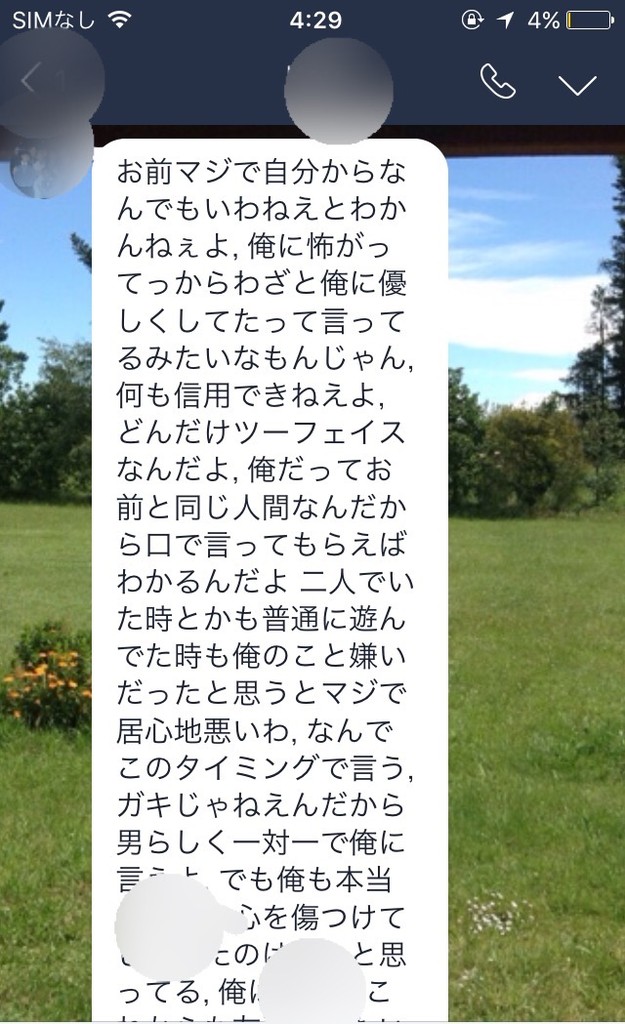 お前マジで自分からなんでもいわねえとわかんねぇよ, 俺に怖がってっからわざと俺に優しくしてたって言ってるみたいなもんじゃん, 何も信用できねえよ, どんだけツーフェイスなんだよ, 俺だってお前と同じ人間なんだから口で言ってもらえばわかるんだよ