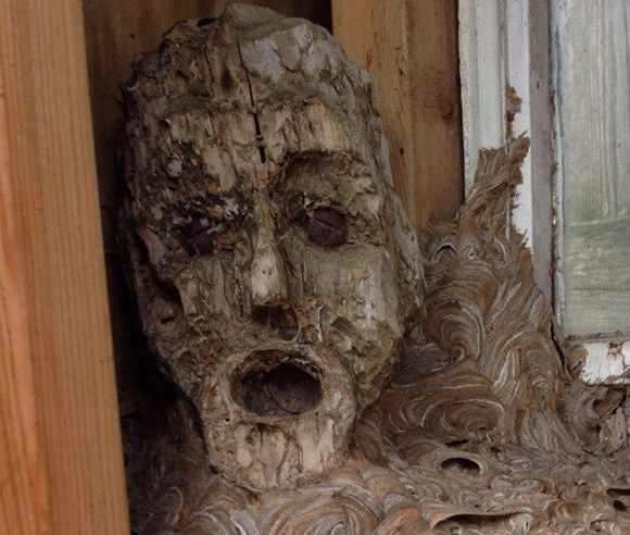 3年ぶりに庭にある物置小屋を開けたところ、いきなり口を開けた怪しい人面スズメバチの巣と遭遇しちゃったというのだからたまらない。