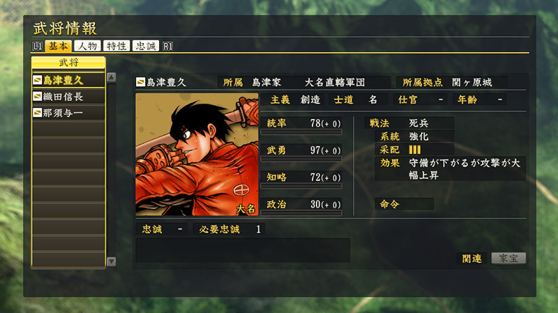 統率:11武力:87知力:58政治:44魅力:20