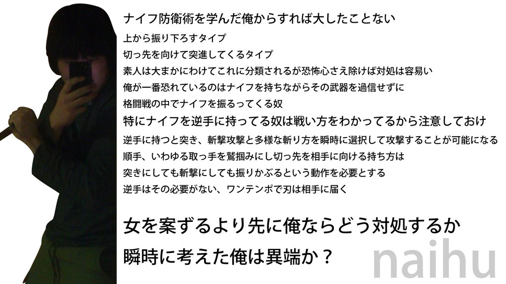 確か逆手に持つと殺意があると認定されるんだよなw