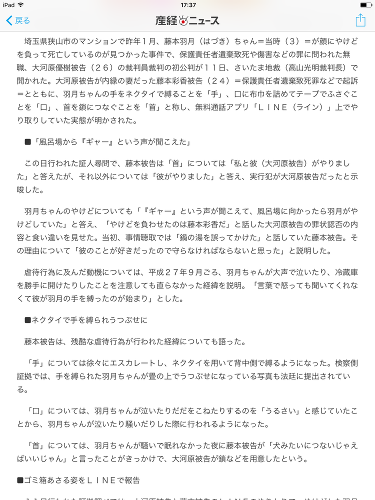 羽月ちゃんが十分に食事を与えられず、ゴミ箱をあさって食べ物を探していたことなどを藤本被告が大河原被告にLINEで報告している様子も説明された。