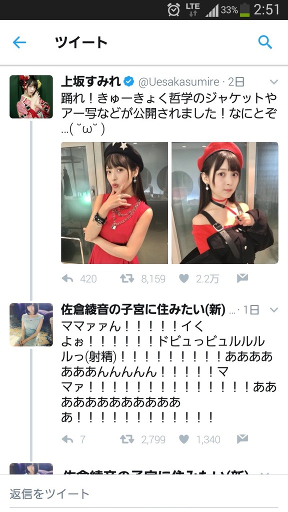 関連記事【悲報】声優の上坂すみれさんのファンには本人に自慰報告をするキチガイしかいないという事実【悲報】ツイッターで声優・上坂すみれさんに性的なリプを送ってブロックされる遊びが流行中【悲報】上坂すみれさん、「ママァァん!!イくよぉ!!ドビュっビュルルルっ(射精)」とクソリプと飛ばすファンをブロック上坂すみれとかいう顔見ただけで金玉ずっしり重くなっちゃうドスケベ声優wwwwwww