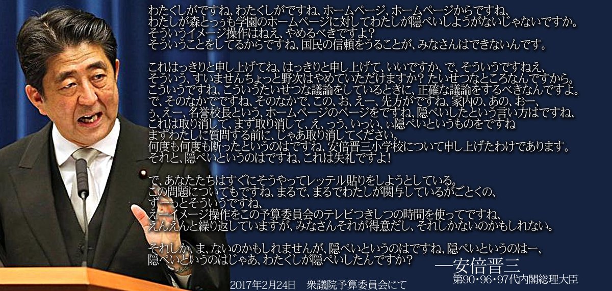 安倍「いえ、ですからね、そういうことをですね、まさしくですね、私が申し上げるのはですね、申し上げたいのはですね、つまりですね、なんというかですね、ともかく、そういうことを申し上げたいと申しているわけでありまして、、、」