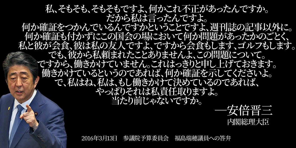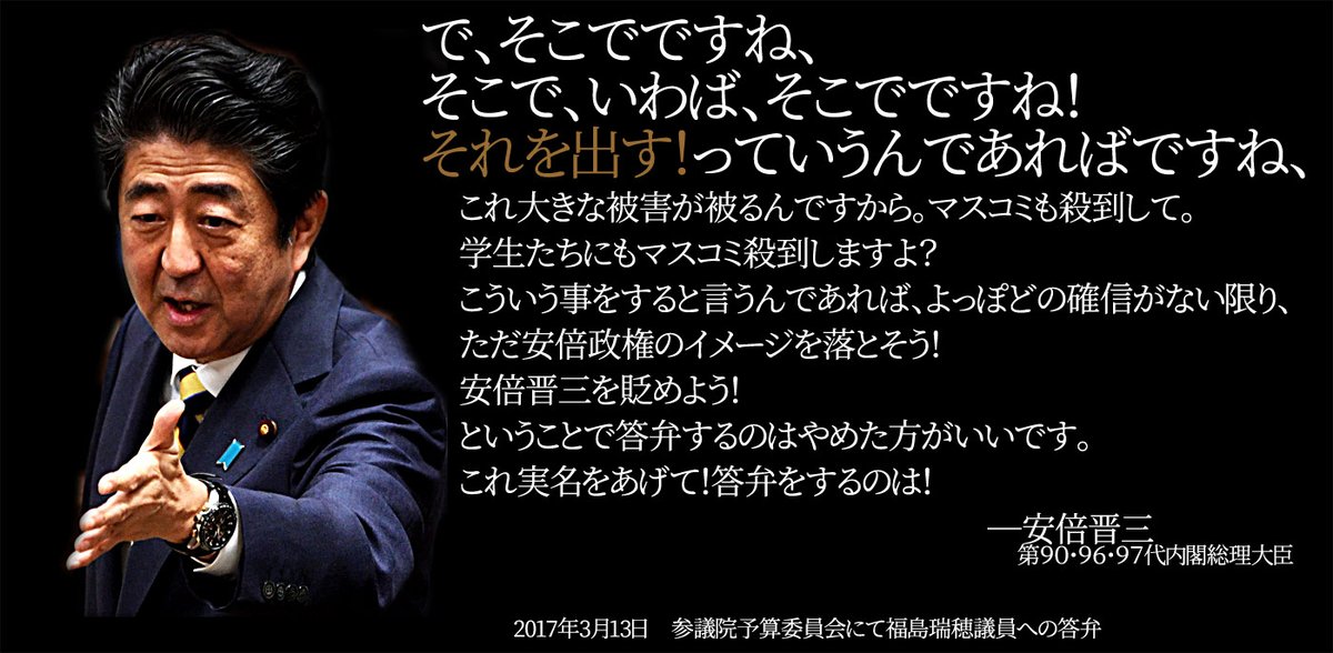 安倍「先程の答弁で宮崎議員が認識の間違いをされていたようなので、責任について述べる前に説明します。
